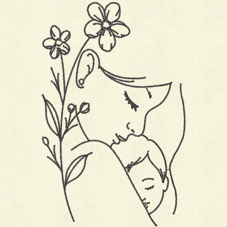 A delicate and elegant line art embroidery design of a mother holding her baby with floral accents. Includes 3 sizes for all your embroidery projects.