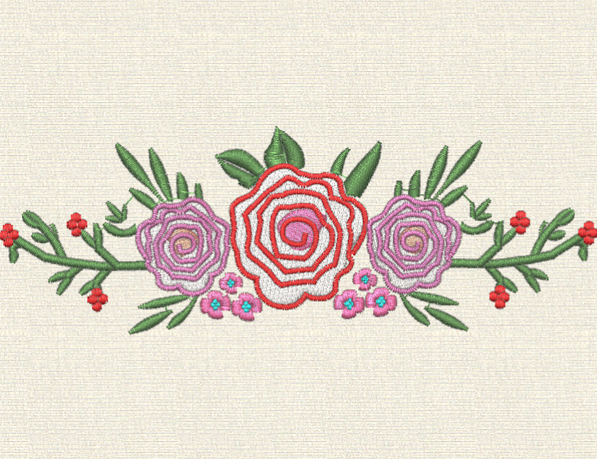 Add a touch of classic elegance to your projects with this Symmetrical Rose Border. This beautifully balanced design features a central red rose flanked by soft pink blossoms, delicate greenery, and tiny berry accents. Its horizontal orientation makes it the perfect decorative element for a wide variety of textile applications.