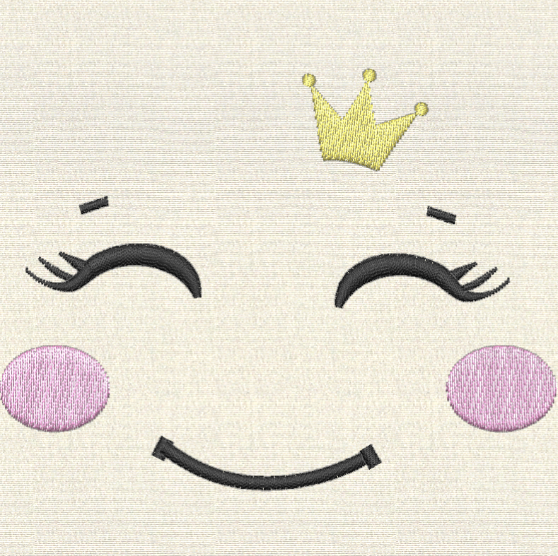 Bring joy and sweetness to your next embroidery project with this Smiling Princess Face embroidery design! Featuring a charming smile, closed eyes with lashes, rosy cheeks, and a little yellow crown, this minimalist and adorable design is perfect for baby clothes, nursery decor, or accessories for little girls.